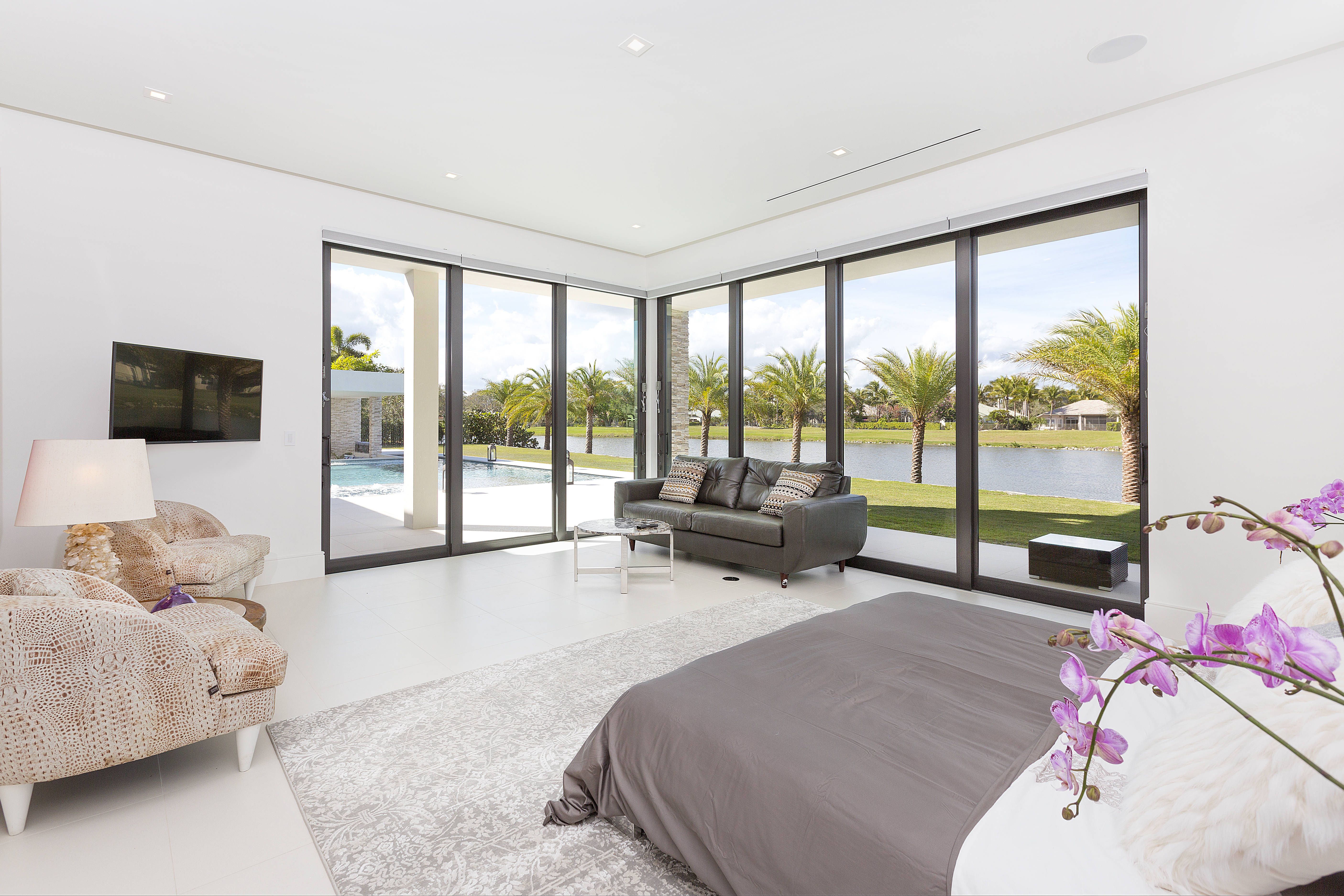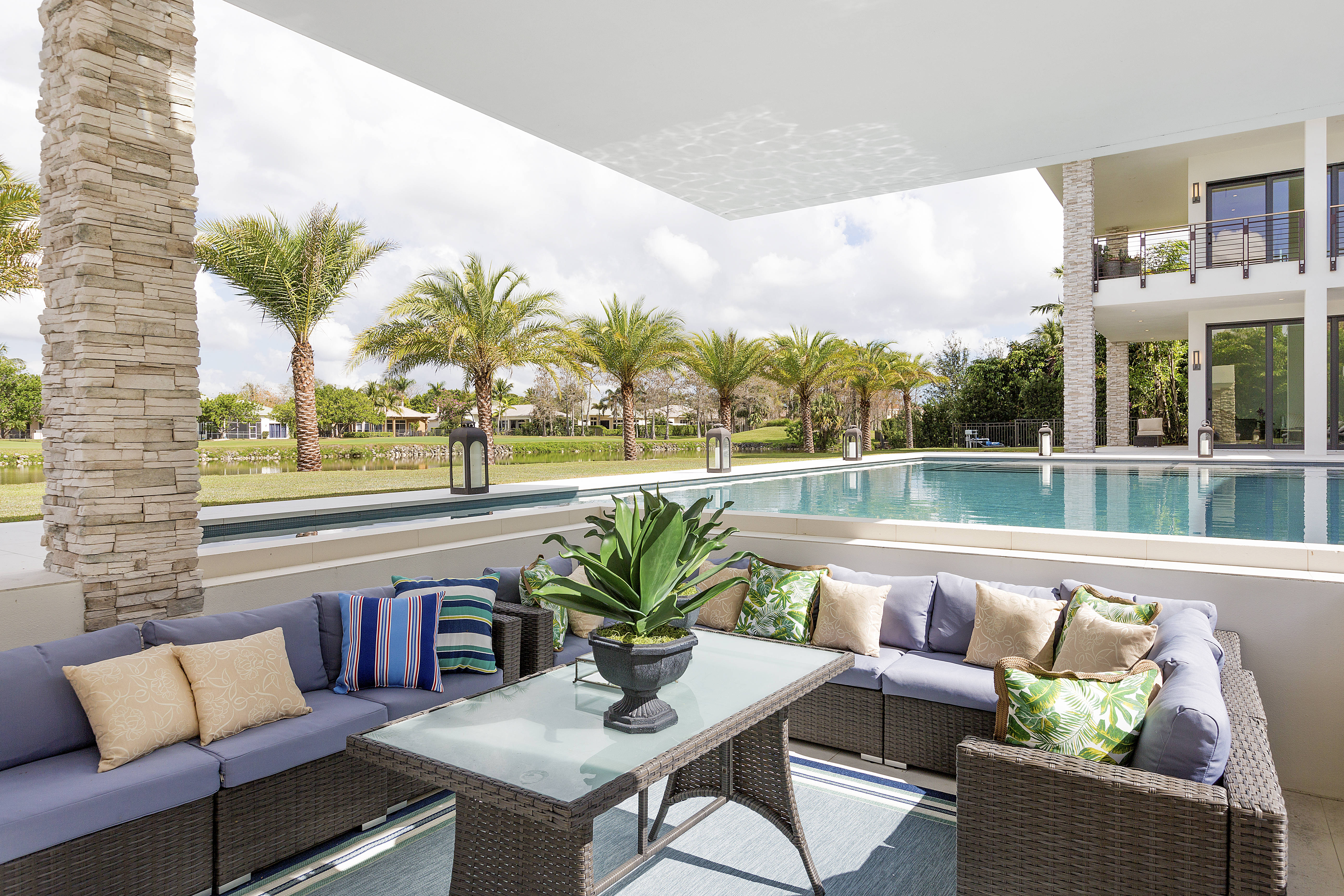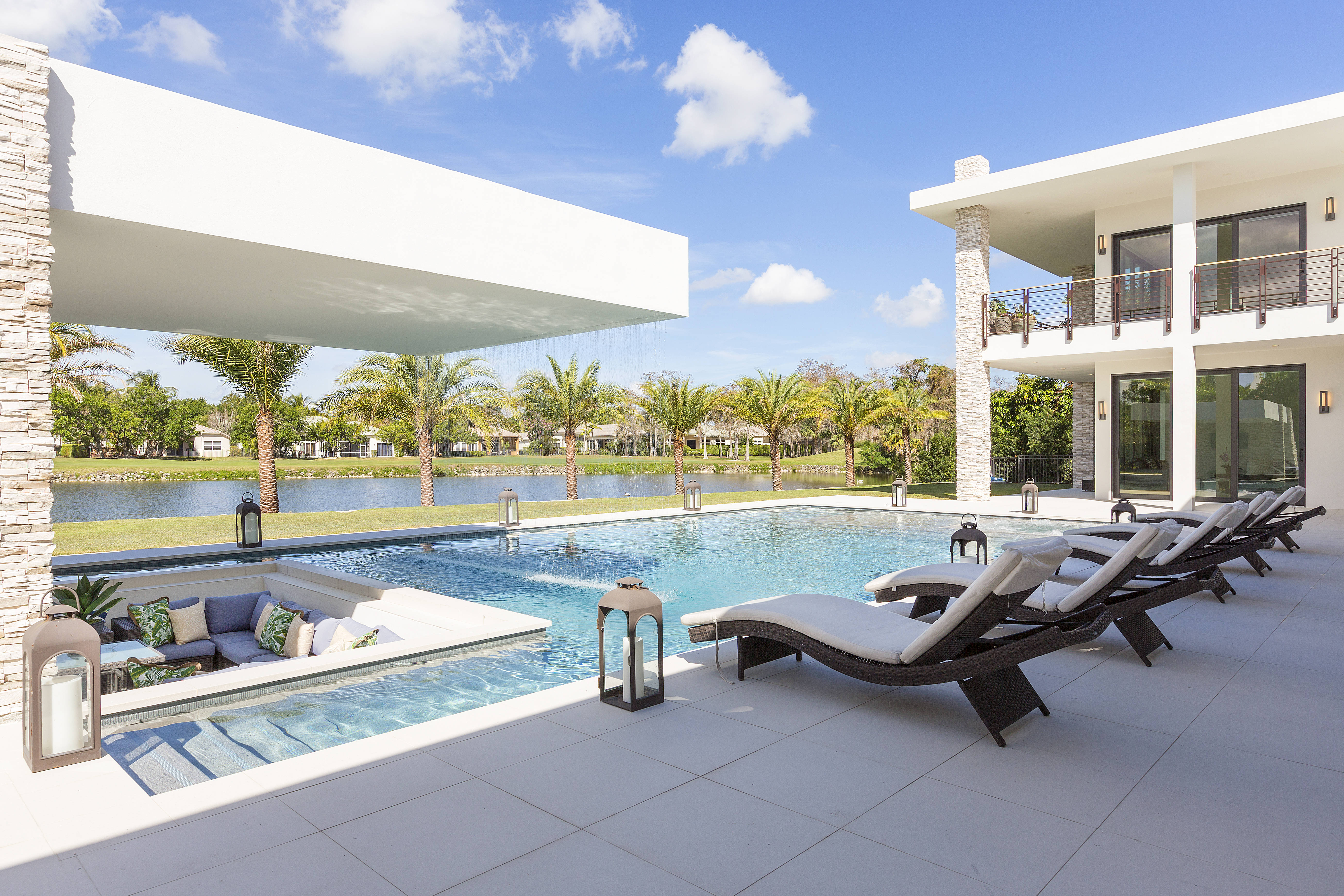Live and entertain like a Rock Star in the newest and most sought-after community in Wellington's Palm Beach Polo Club. The exquisitely constructed, gated, 6-bedroom/8.5-bath lake-view transitional home was designed by Insite Design Group. Boasting a double master suite on both floors, outdoor shower, two double garages with pull-through design and a staff / in-law quarters with private entrance. Enjoy sunset water views behind the cascading waterfall from the comfort of the sunken lounge. Unprecedented and extraordinary swimmers dream pool & spa, terrace, entertainment area and summer kitchen.